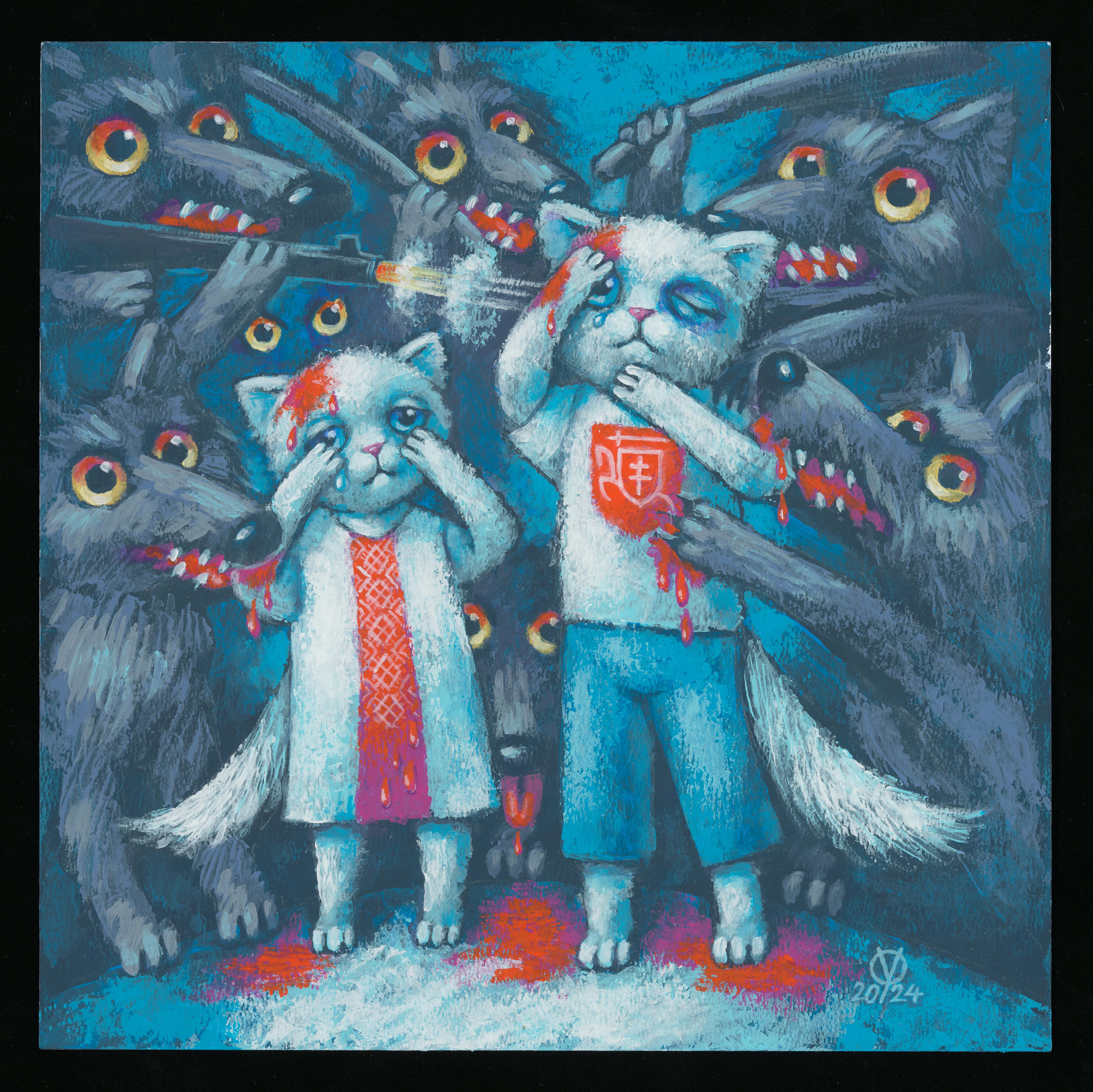 Малюнак Вольгі Якубоўскай з ваўкамі і акрываўленымі коцікамі