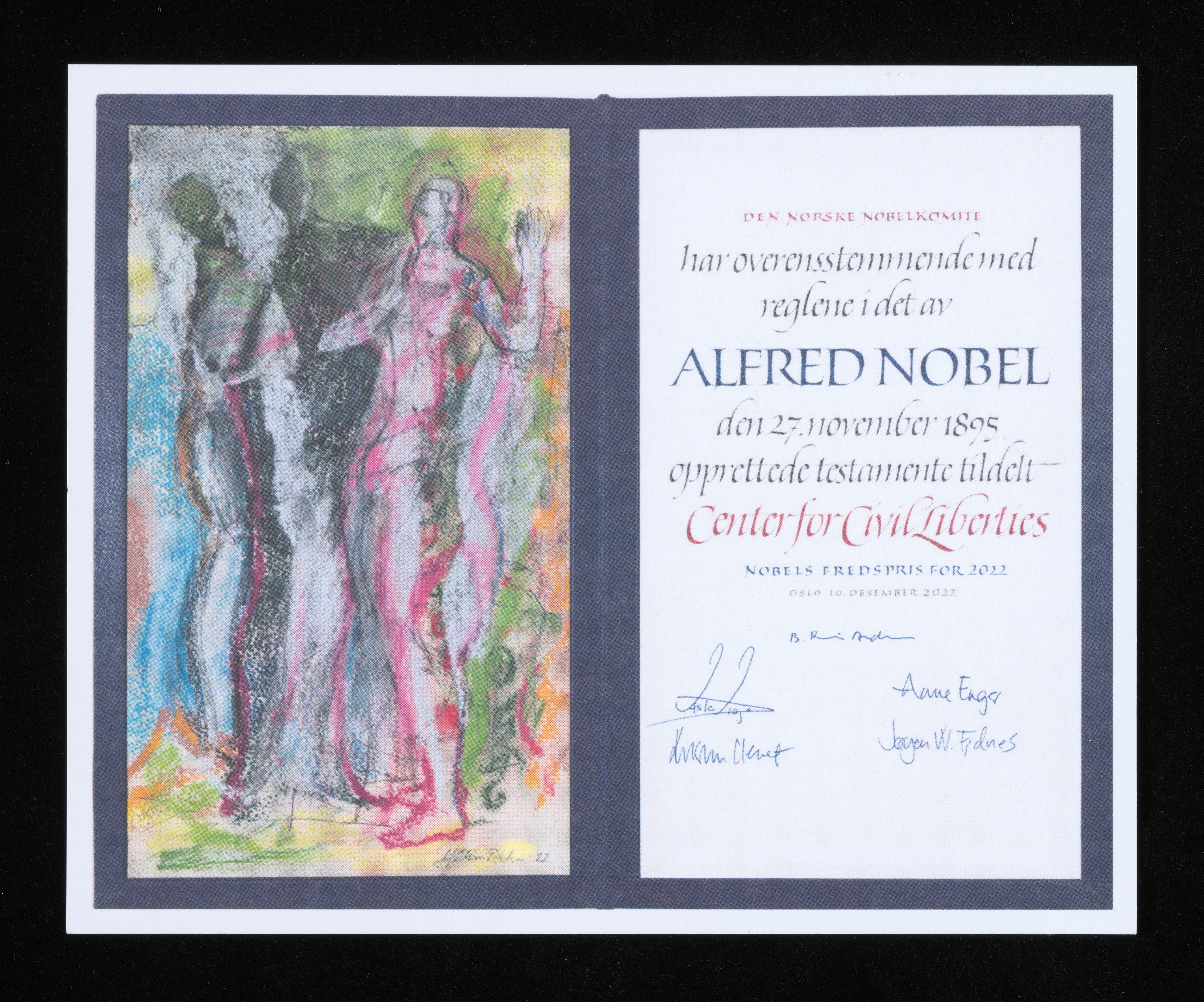 Нобелеўскі камітэт, мастак - Хакон Блекен, каліграфіст - Крыстафер Хаанес