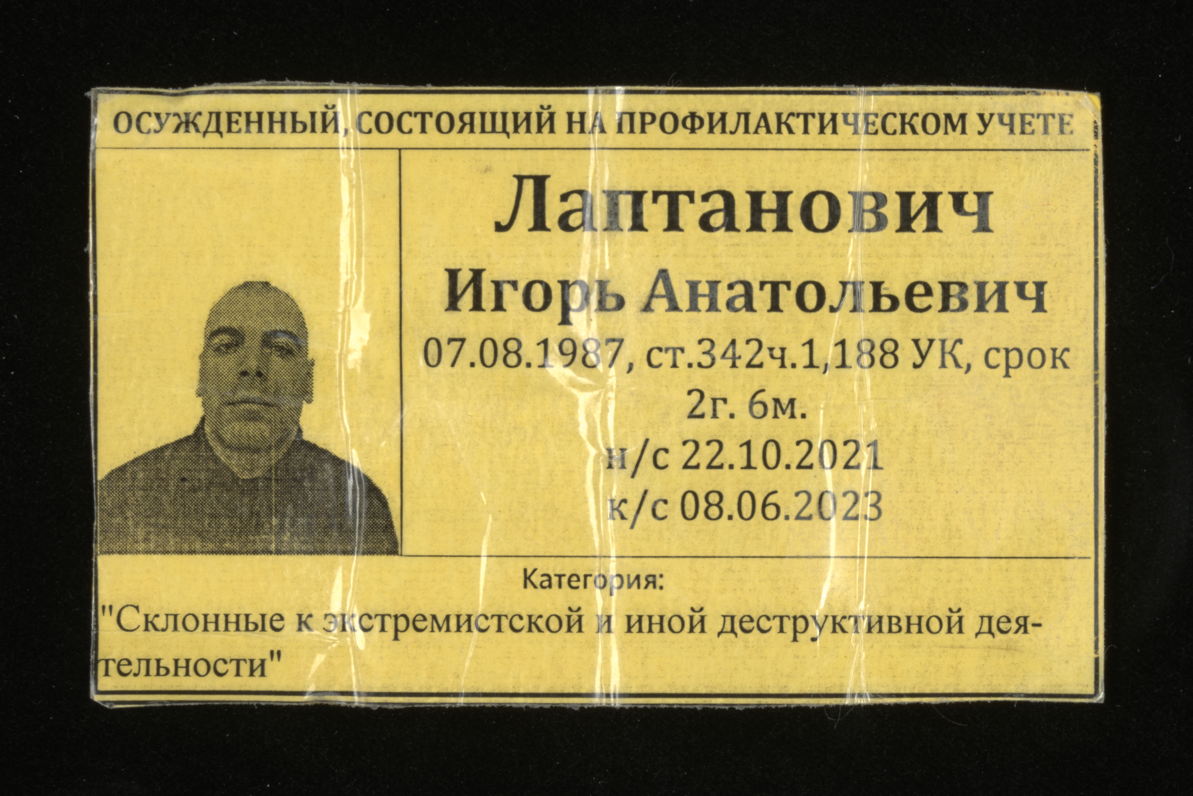 Жоўтая бірка з ложка палітзняволенага Ігара Лаптановіча